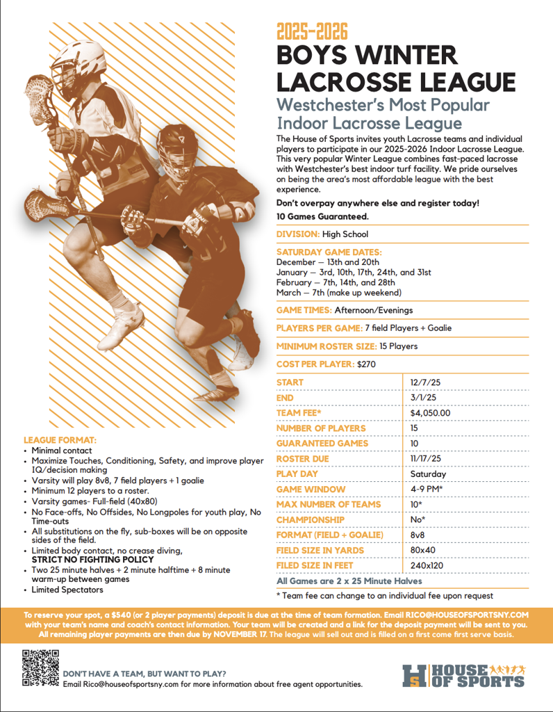 The House of Sports invites youth Lacrosse teams and individual players to participate in our 2024-2025 Indoor Lacrosse League. This very popular Winter League combines fast-paced lacrosse with Westchester's best indoor turf facility. We pride ourselves on being the area's most affordable league with the best experience. Don't overpay anywhere else and register today!